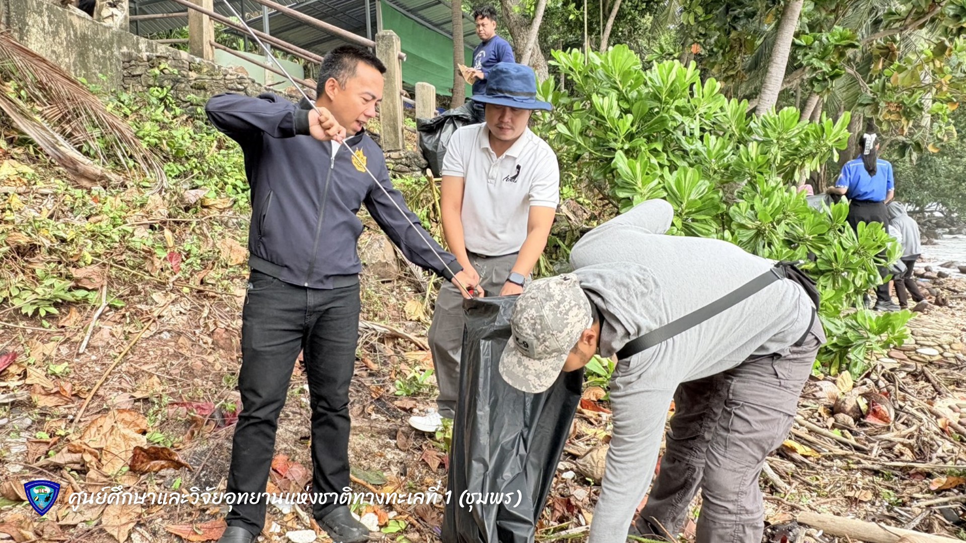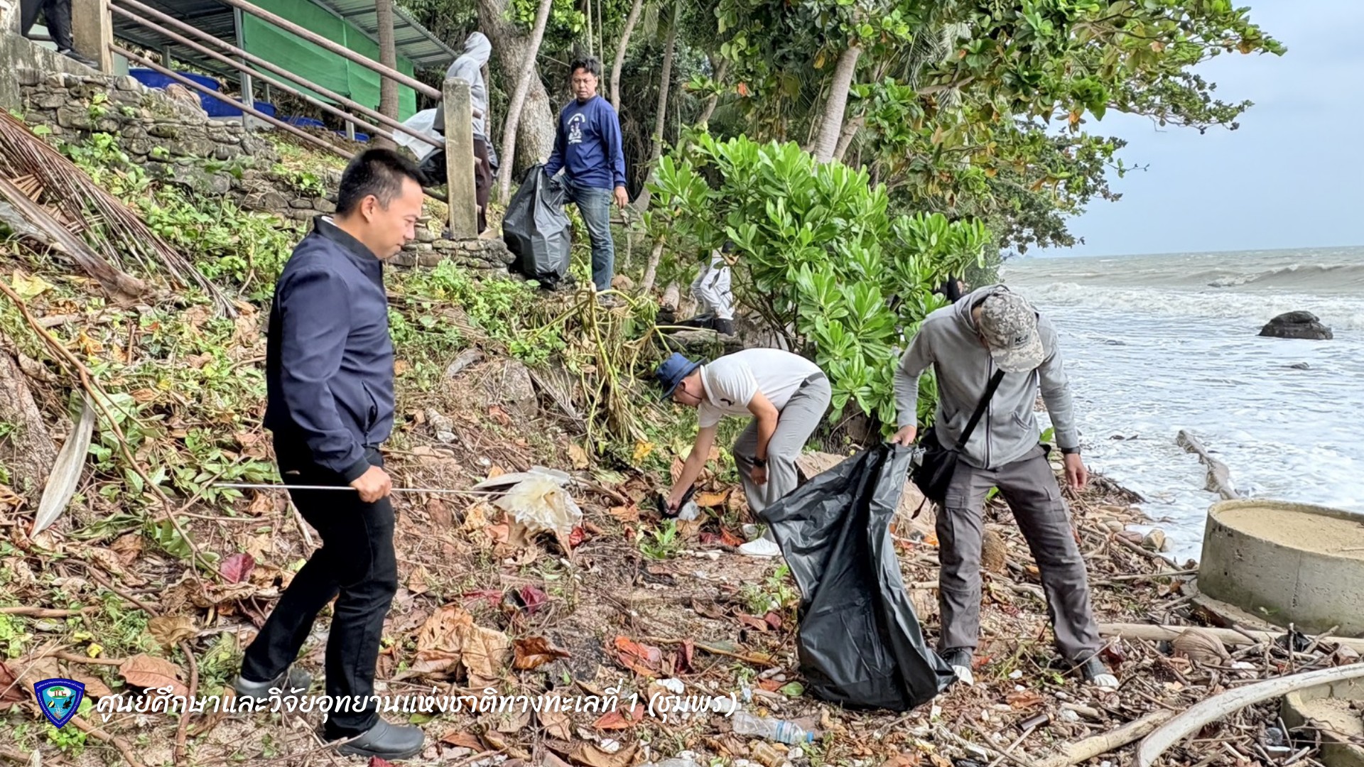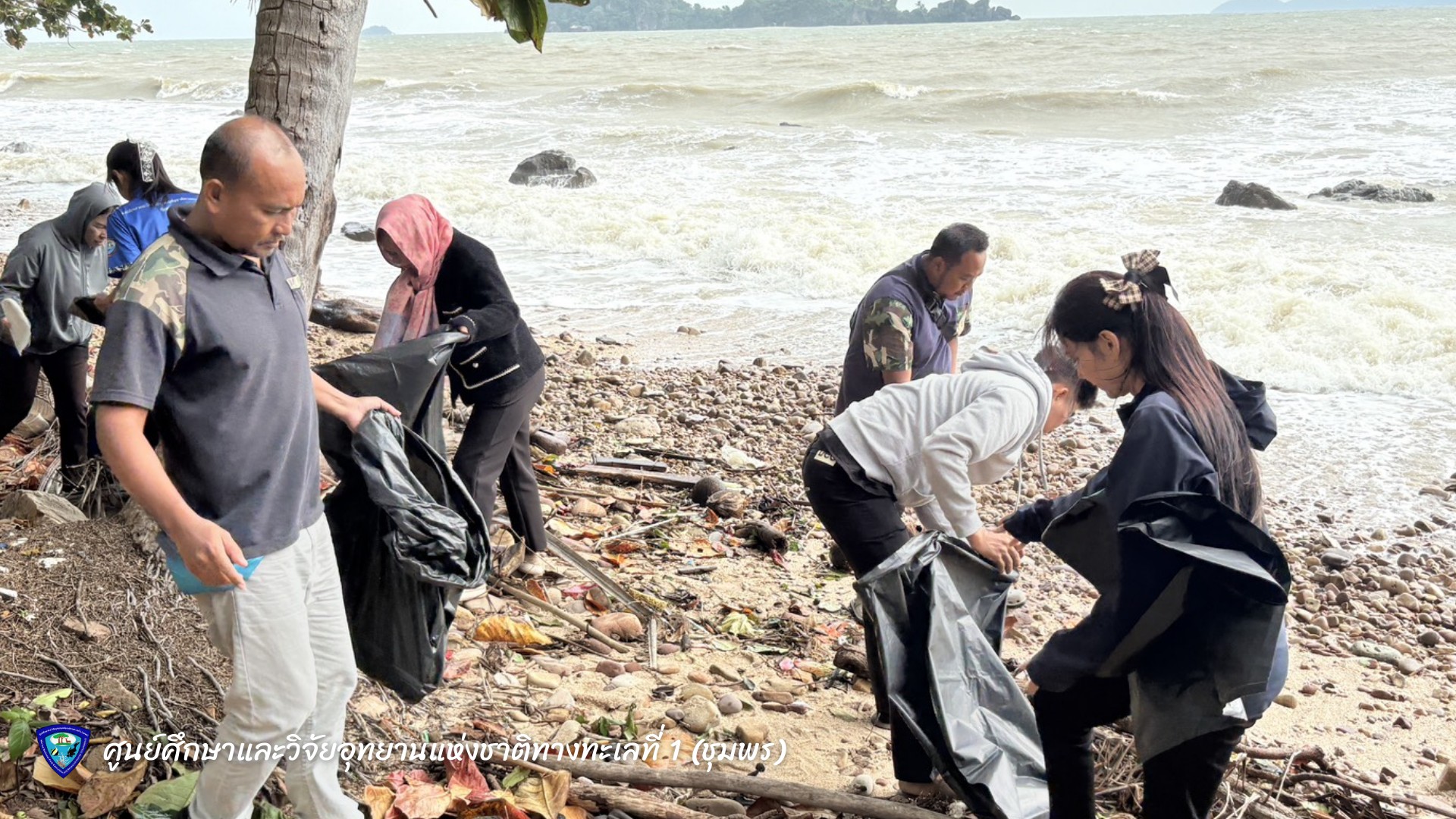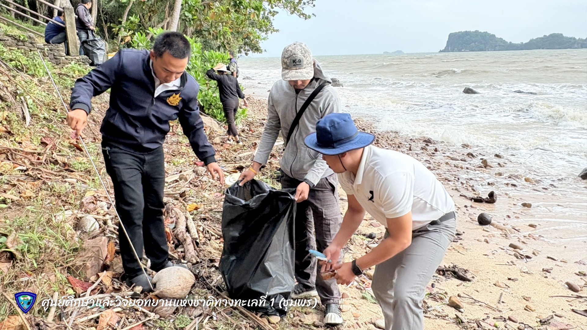 นายมรกต โจวรรณถะ หัวหน้าศูนย์ศึกษาและวิจัยอุทยานแห่งชาติทางทะเลที่ 1 (ชุมพร) พร้อมเจ้าหน้าที่ ร่วมกันเก็บขยะและคัดแยกขยะมูลฝอยบริเวณชายหาดทรายรี ตำบลหาดทรายรี อำเภอเมือง จังหวัดชุมพร เพื่อรักษาความสะอาดและฟื้นฟูสภาพแวดล้อมชายฝั่งทะเลให้คงความสมบูรณ์งดงาม