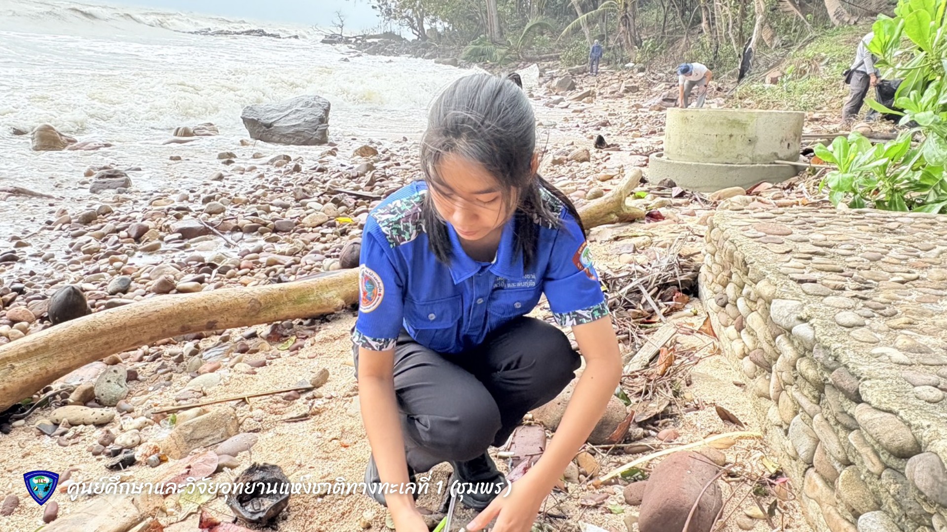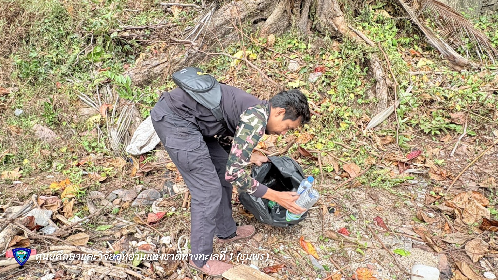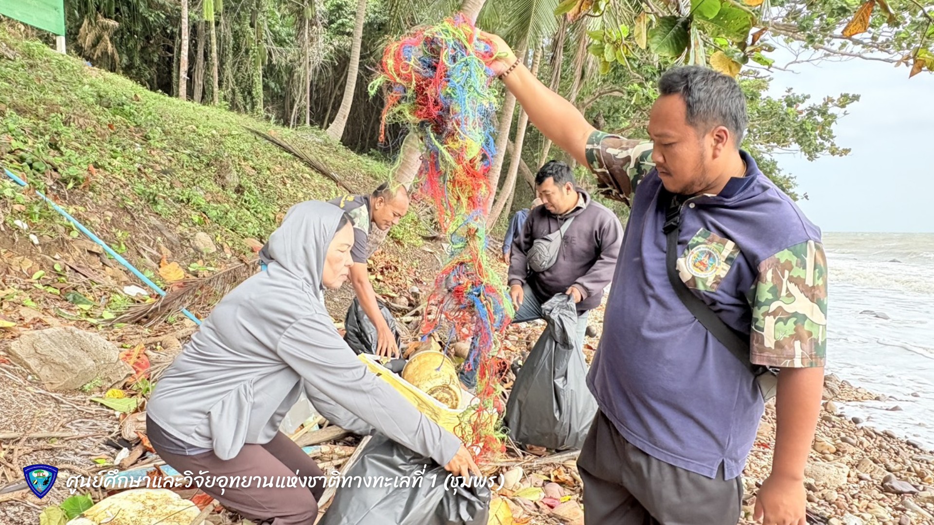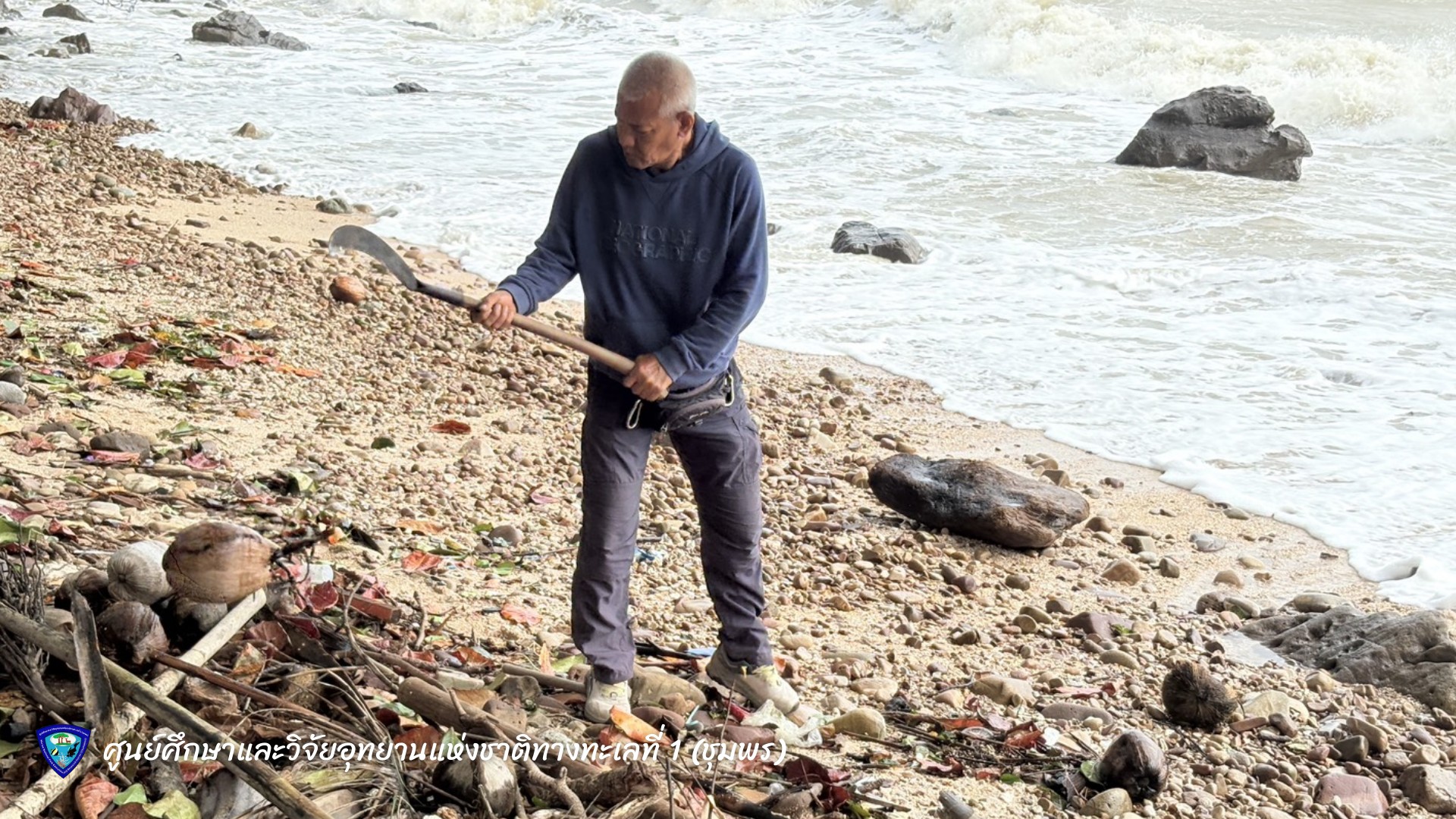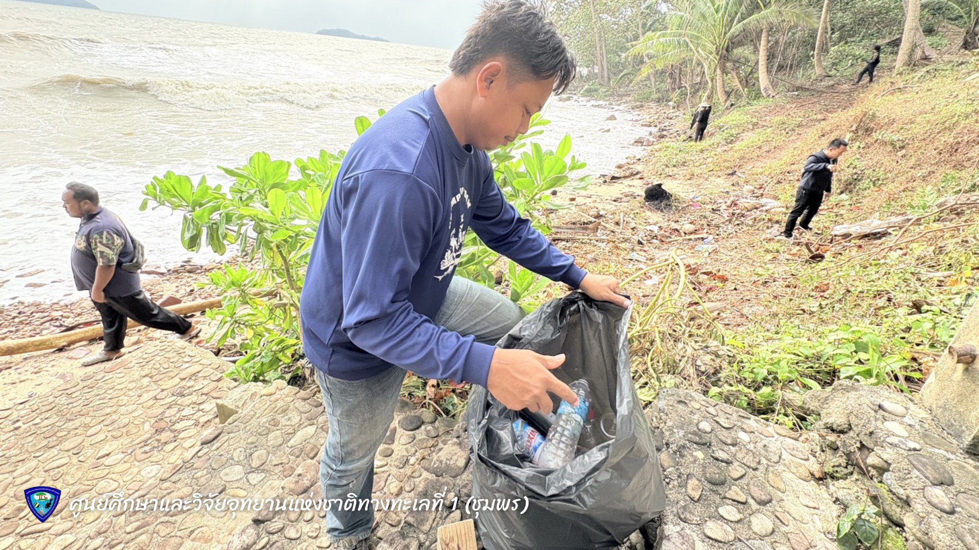 นายมรกต โจวรรณถะ หัวหน้าศูนย์ศึกษาและวิจัยอุทยานแห่งชาติทางทะเลที่ 1 (ชุมพร) พร้อมเจ้าหน้าที่ ร่วมกันเก็บขยะและคัดแยกขยะมูลฝอยบริเวณชายหาดทรายรี ตำบลหาดทรายรี อำเภอเมือง จังหวัดชุมพร เพื่อรักษาความสะอาดและฟื้นฟูสภาพแวดล้อมชายฝั่งทะเลให้คงความสมบูรณ์งดงาม